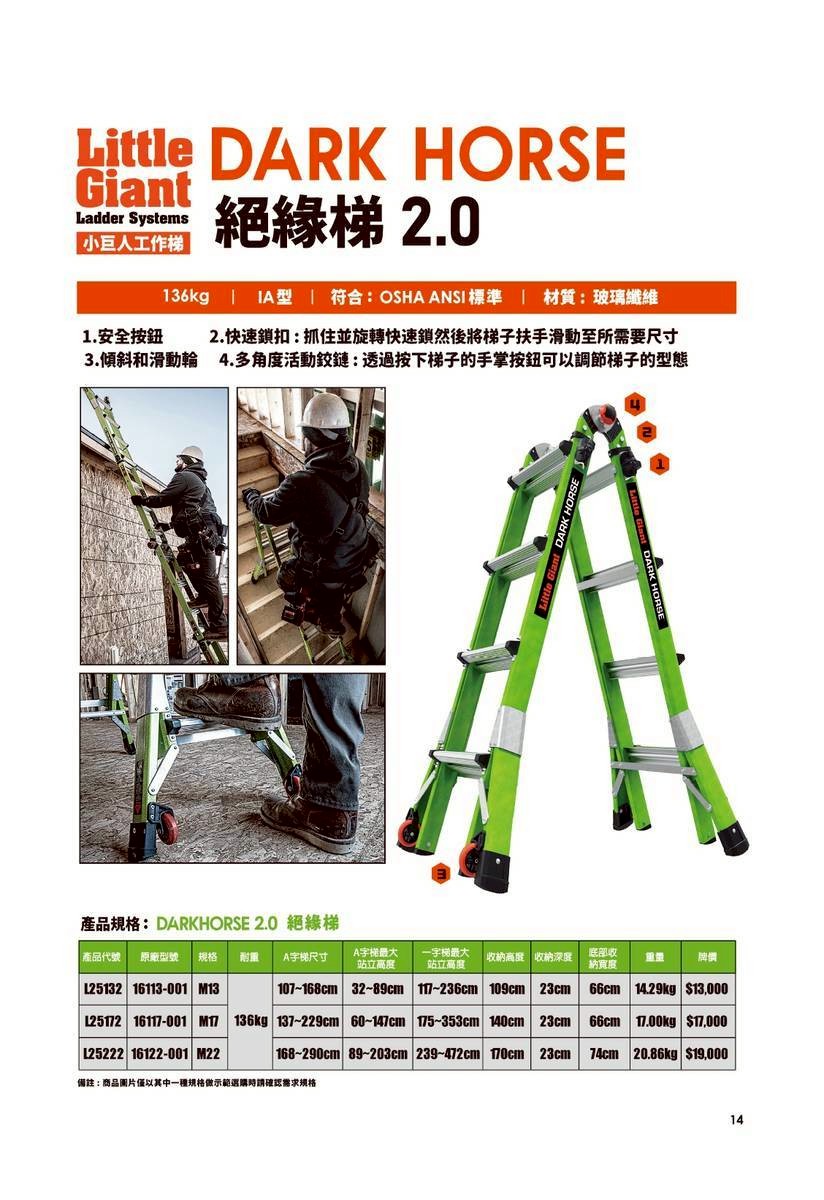 符合OSHA 和ANSI IA型 136kg,使用玻璃纖維材質製成,絕緣設計使工作梯能夠在電力場所安全使用。