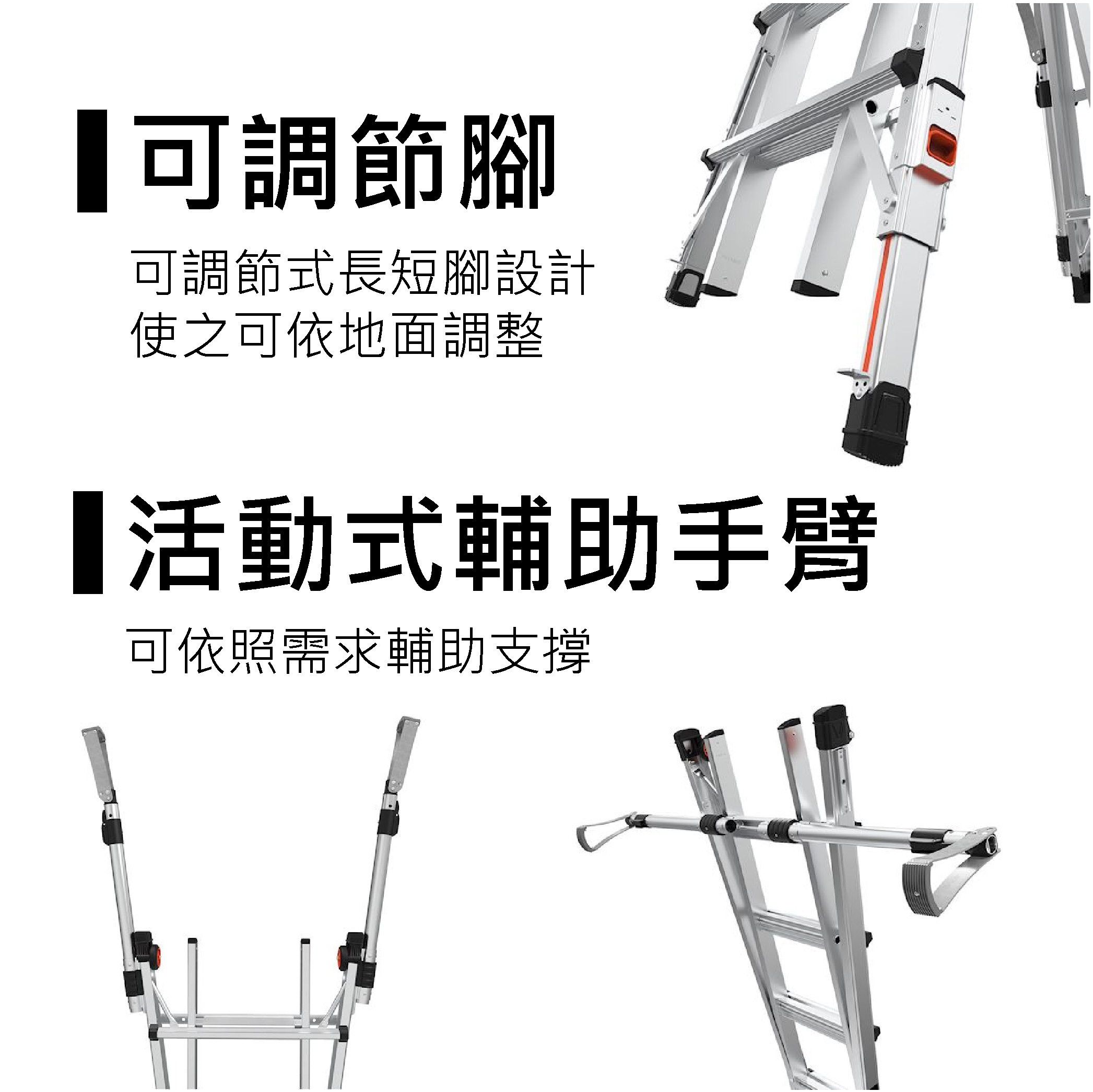 不管是什麼樣的環境和地形,透過長短腳裝置調節高度,使工作梯能夠維持水平位置
