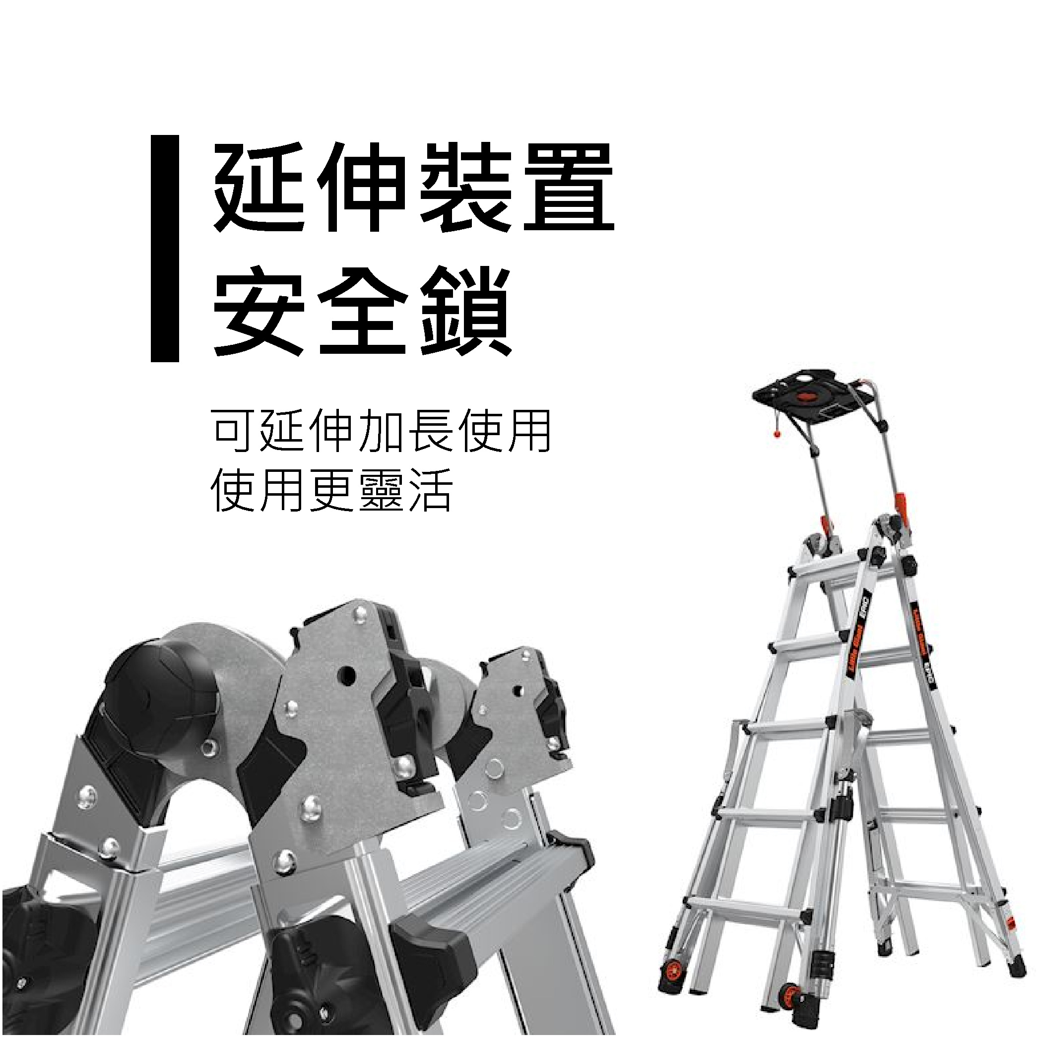 輕鬆扭轉延伸裝置安全鎖,然後將工作梯滑軌移動至所需要的尺寸再次扭轉快速安全鎖即可固定工作梯裝置