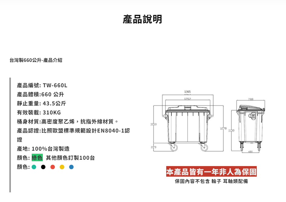 - 桶身材質:高密度聚乙烯(HDPE)抗紫外線材質
