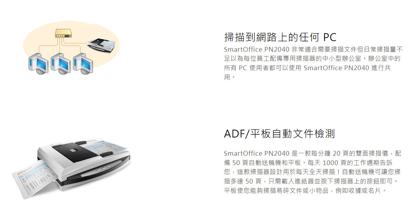 Plustek SmartOffice PN2040 是一款雙面 ADF 和平板掃描儀,其 ADF 速度為 20ppm/40ipm,灰階為 200dpi。 SmartOffice PN2040 使文件掃描變得簡單高效,此外,它還是一種易於使用的基於網路的掃描解決方案,用於在當今的多地點和全球環境中共享文件。此外,當您在PC上安裝我們的驅動程式套件時,您可以使用網路進行連線。