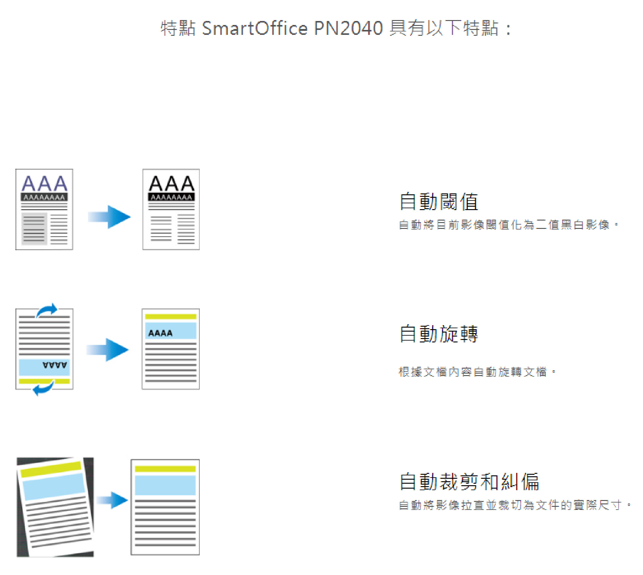 ▪ 具有自動裁切、自動框正和自動預覽等智慧型掃描功能
